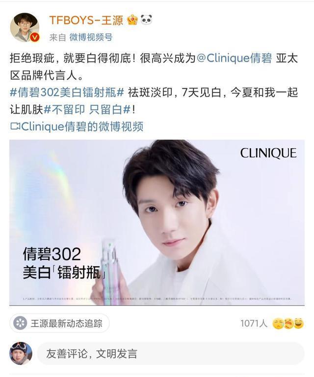 據(jù)悉,王源品牌代言人的身份還未官宣時,就有很多粉絲在倩碧線下專賣店看到了王源的海報。