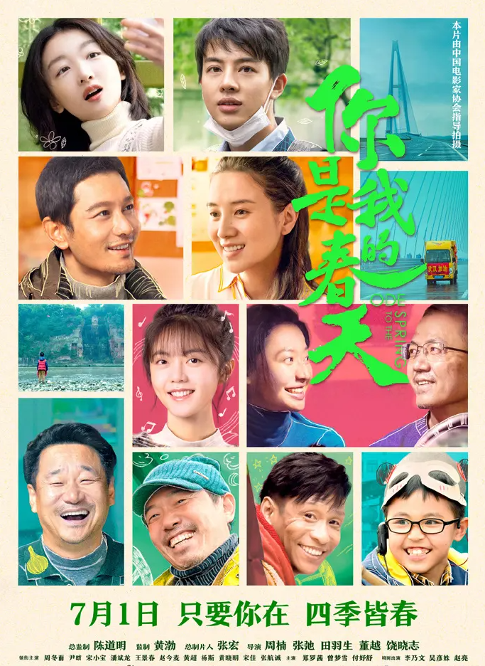 電影《你是我的春天》由中國電影家協(xié)會指導拍攝,陳道明任總監(jiān)制,黃渤任監(jiān)制,張宏任總制片人,周楠、張弛、田羽生、董越、饒曉志執(zhí)導,周冬雨、尹昉、宋小寶、潘斌龍、王景春、趙今麥、黃超、楊斯、黃曉明、宋佳、張航誠(按出場順序)領(lǐng)銜主演,鄭羅茜、曾夢雪、付妤舒主演,李乃文、吳彥姝、趙亮特別出演。影片7月1日全國上映,預售正在火熱進行中!