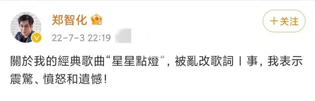 鄭智化(明星經(jīng)紀公司)、知名唱作人,代表作有《水手》和《星星點燈》等,他深夜憤怒發(fā)文后,網(wǎng)友紛紛發(fā)聲支持。有網(wǎng)友稱此番改編是畫蛇添足,讓原本經(jīng)典的《星星點燈》變成了另外一首歌。