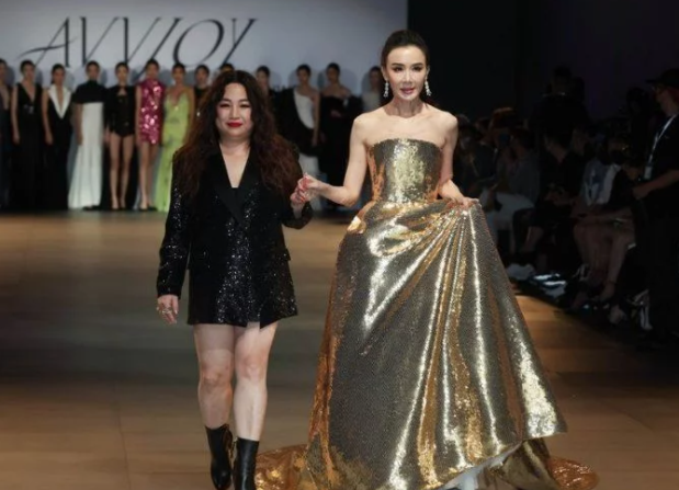 在大秀結(jié)束之后,設(shè)計師好友也與蕭薔一起現(xiàn)身謝幕,兩人手挽著手走上舞臺,因為裙子材質(zhì)特殊,自重太重,蕭薔甚至需要用手拎著走,可謂是眾人矚目的焦點,如女王般氣場強大。