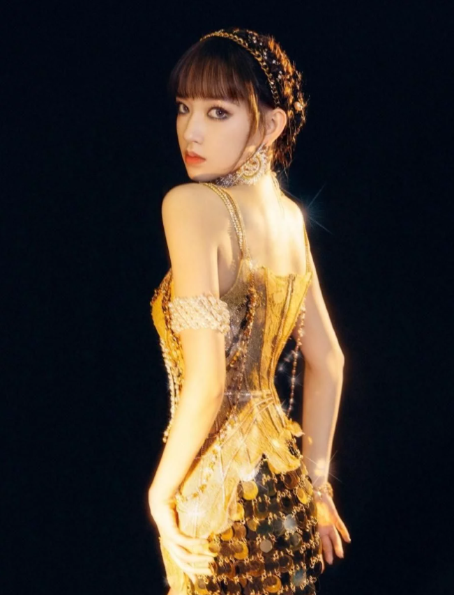 》舞蹈版《吉巴羅》造型照釋出,照片中,她身著金色亮片裙,戴著面具,異域風情造型眼神魅惑。