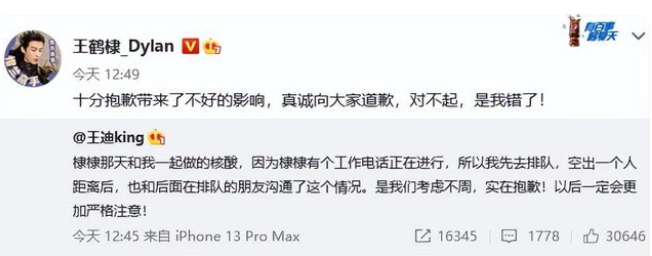 8月19日,王鶴棣助理發(fā)文稱:“棣棣那天和我一起做的核酸,因?yàn)殚﹂τ袀€(gè)工作電話正在進(jìn)行,所以我先去排隊(duì),空出一個(gè)人距離后,也和后面在排隊(duì)的朋友溝通了這個(gè)情況。是我們考慮不周,實(shí)在抱歉!以后一定會(huì)更加嚴(yán)格注意! ”