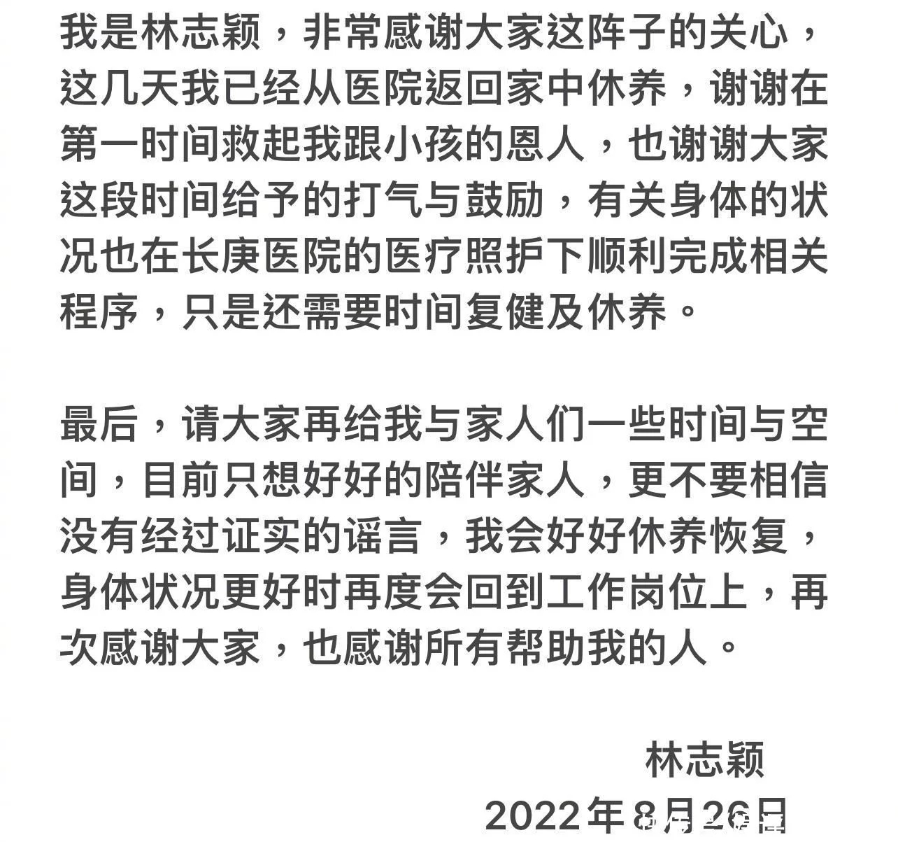 2022年8月26日,林志穎(明星經(jīng)紀公司)遭遇嚴重車禍后,首次發(fā)微博報平安,透露自己已經(jīng)從醫(yī)院返回家中休養(yǎng),身體狀況也在醫(yī)院照護下順利完成相關程序。