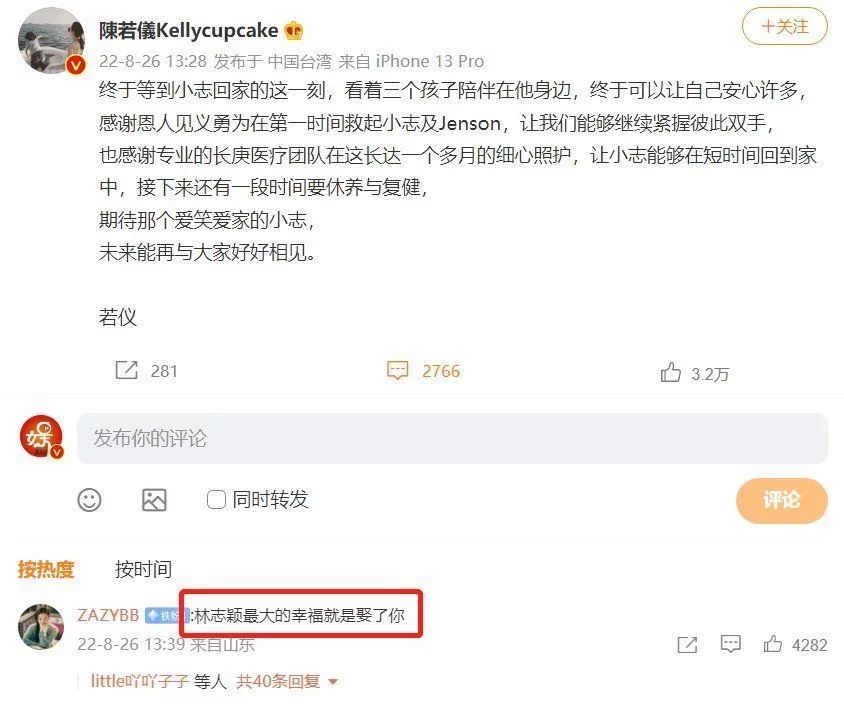 隨后,林志穎的妻子陳若儀也在微博發(fā)文:“終于等到小志回家的這一刻,看著三個孩子陪伴在他身邊,終于可以讓自己安心許多。期待那個愛笑愛家的小志,未來能再與大家好好相見。”粉絲留言對陳若儀說:“林志穎最大的幸福就是娶了你。”