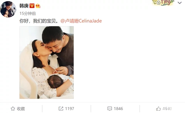 9月9日,韓庚(明星經(jīng)紀公司)發(fā)微博自曝妻子盧靖姍(明星經(jīng)紀公司)順利生產(chǎn),并曬出了一家三口的合照,宣布女兒出生啦!