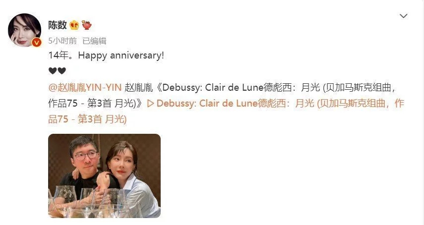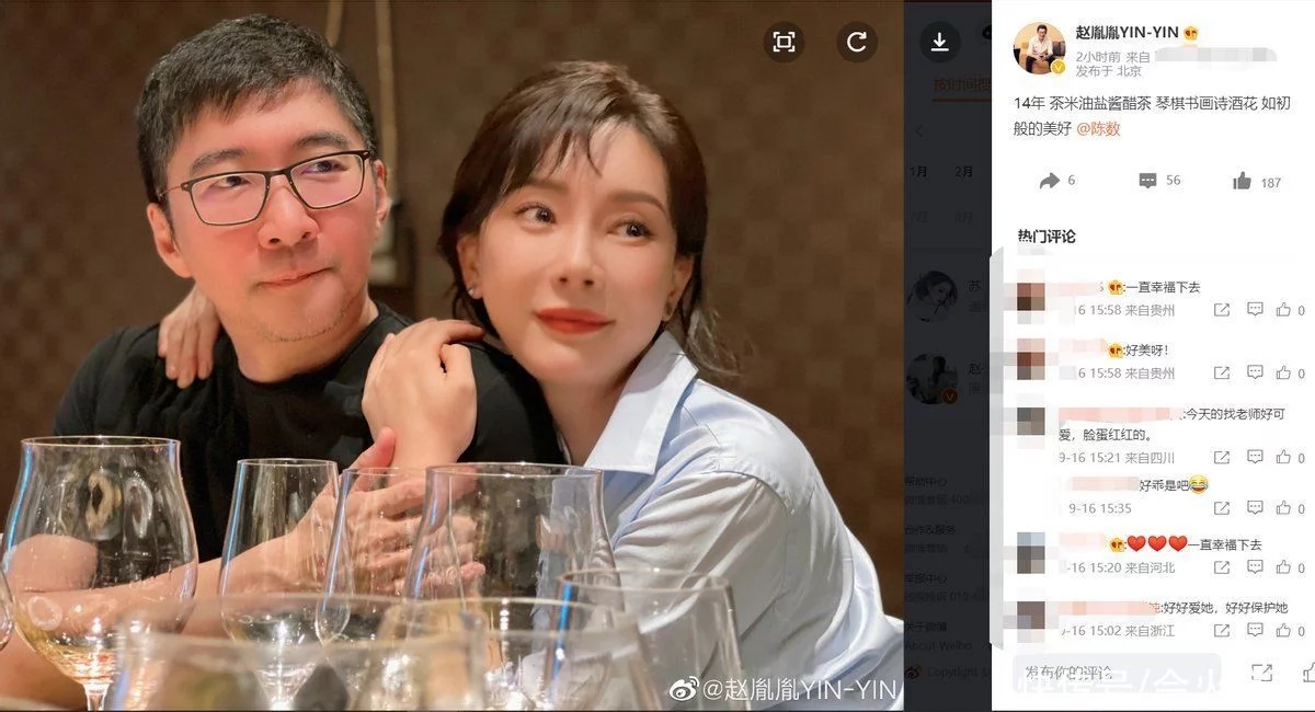 近日,演員陳數(shù)(明星經(jīng)紀(jì)公司)在社交平臺曬出與老公趙胤胤的合影高調(diào)秀恩愛,并配文“14年,happy anniversary”艾特老公趙胤胤,引發(fā)網(wǎng)友熱議。
