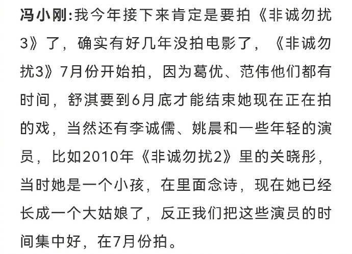 近日,馮小剛在接受采訪時(shí)透露電影《非誠(chéng)勿擾3》即將開拍,主演葛優(yōu)、舒淇、范偉李誠(chéng)儒、姚晨關(guān)曉彤等原班人馬都將回歸。為確保全部主演都有檔期,開拍時(shí)間定于今年7月份。