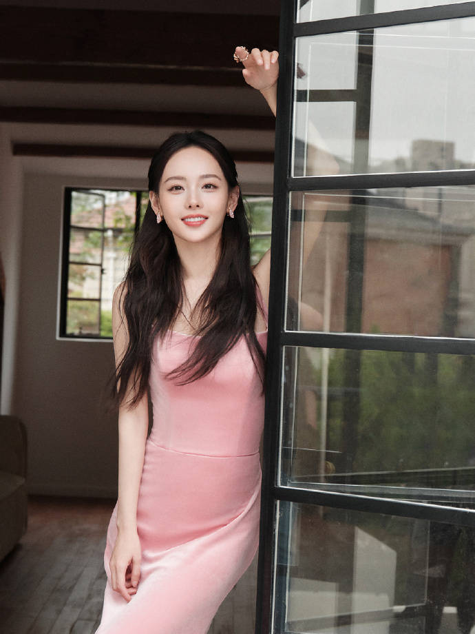 張嘉倪身穿粉色吊帶連衣裙,她俏臉甜美,眉清目秀,唇紅齒白,長發(fā)飄逸,她單手扶著窗戶,曼妙的身材曲線優(yōu)越,微微一笑很傾城!
