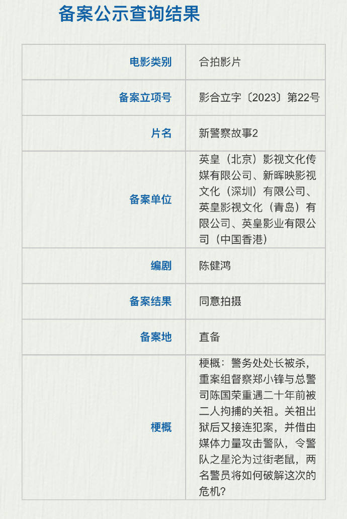 電影《新警察故事2》備案 謝霆鋒首次自導(dǎo)自演