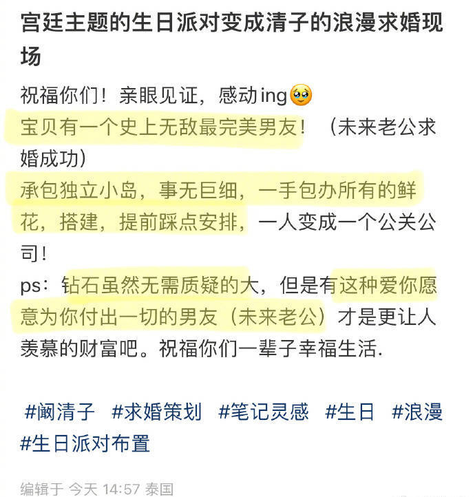 5月31日,闞清子(明星經(jīng)紀(jì)公司)好友在社交平臺(tái)上發(fā)文,透露闞清子男友為闞清子承包獨(dú)立小島補(bǔ)過(guò)生日,并一手包辦將小島打造成浪漫的求婚現(xiàn)場(chǎng),求婚鉆戒更是無(wú)需質(zhì)疑的大,還夸他是史上無(wú)敵最完美男友。