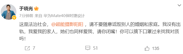 6月1日,某狗仔爆料于曉光出軌曾參加浪姐的離婚女星,引發(fā)熱議。剛剛,于曉光(明星經(jīng)紀(jì)公司)在社交平臺上發(fā)文否認(rèn):“這是法治社會,@超能攝影陽陽 ,請不要隨意詆毀別人的婚姻和家庭。我沒有出軌,我愛我的家人,她們也同樣愛我,請你閉嘴!你可以摘下口罩過來找我對質(zhì)嗎!”