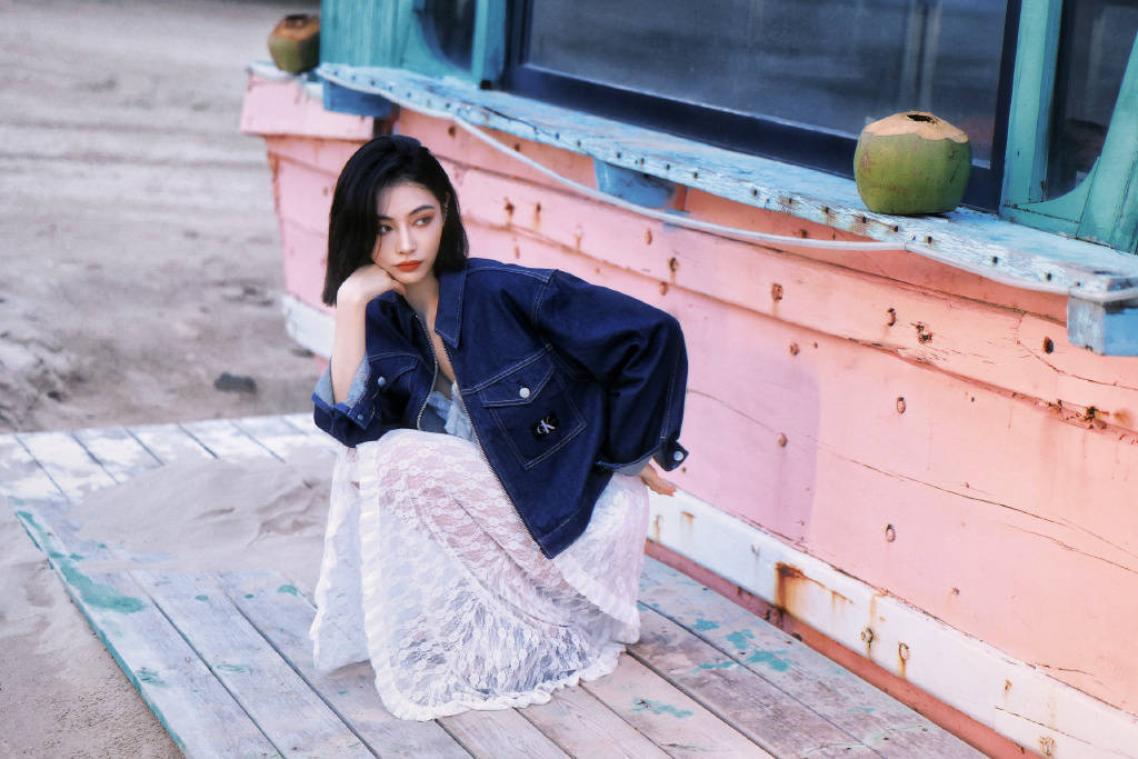 許佳琪海邊漫步感受夏末微風(fēng) 白裙搭牛仔衣有個性