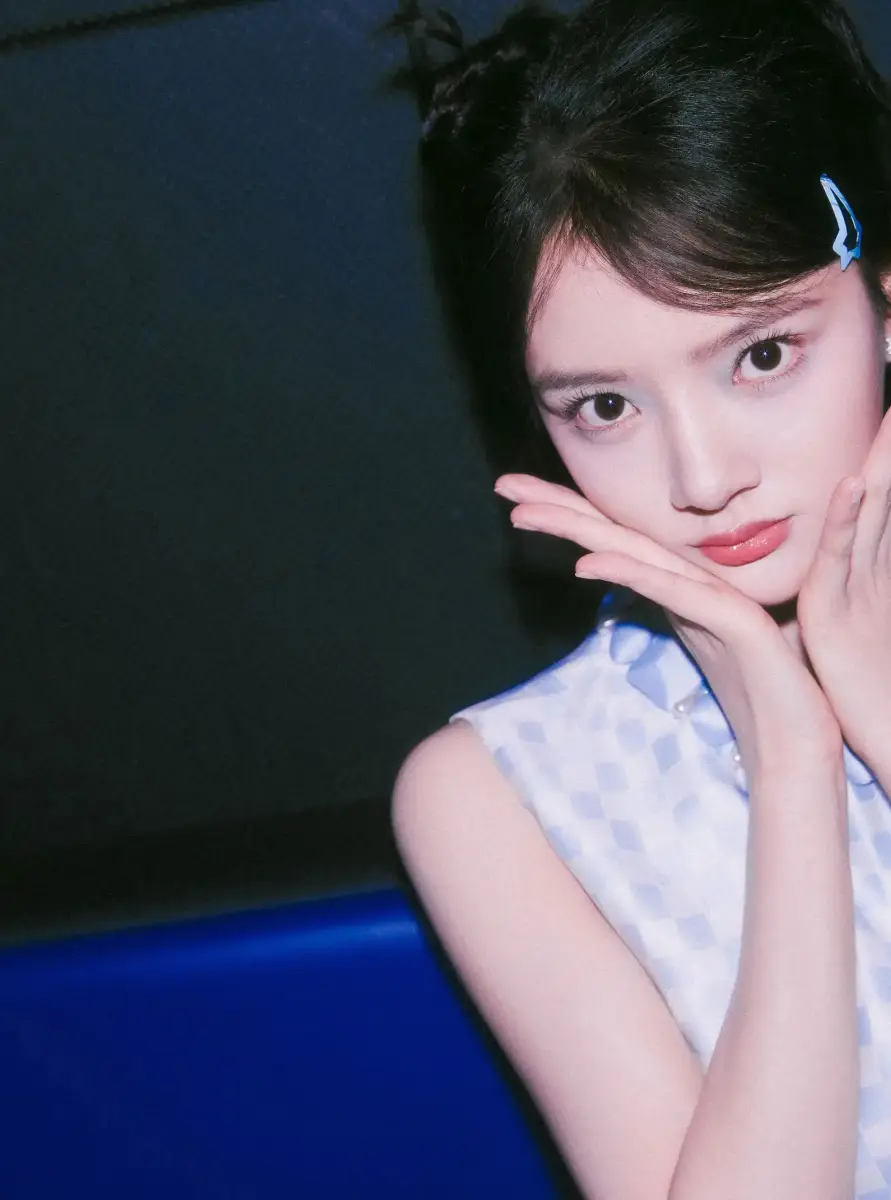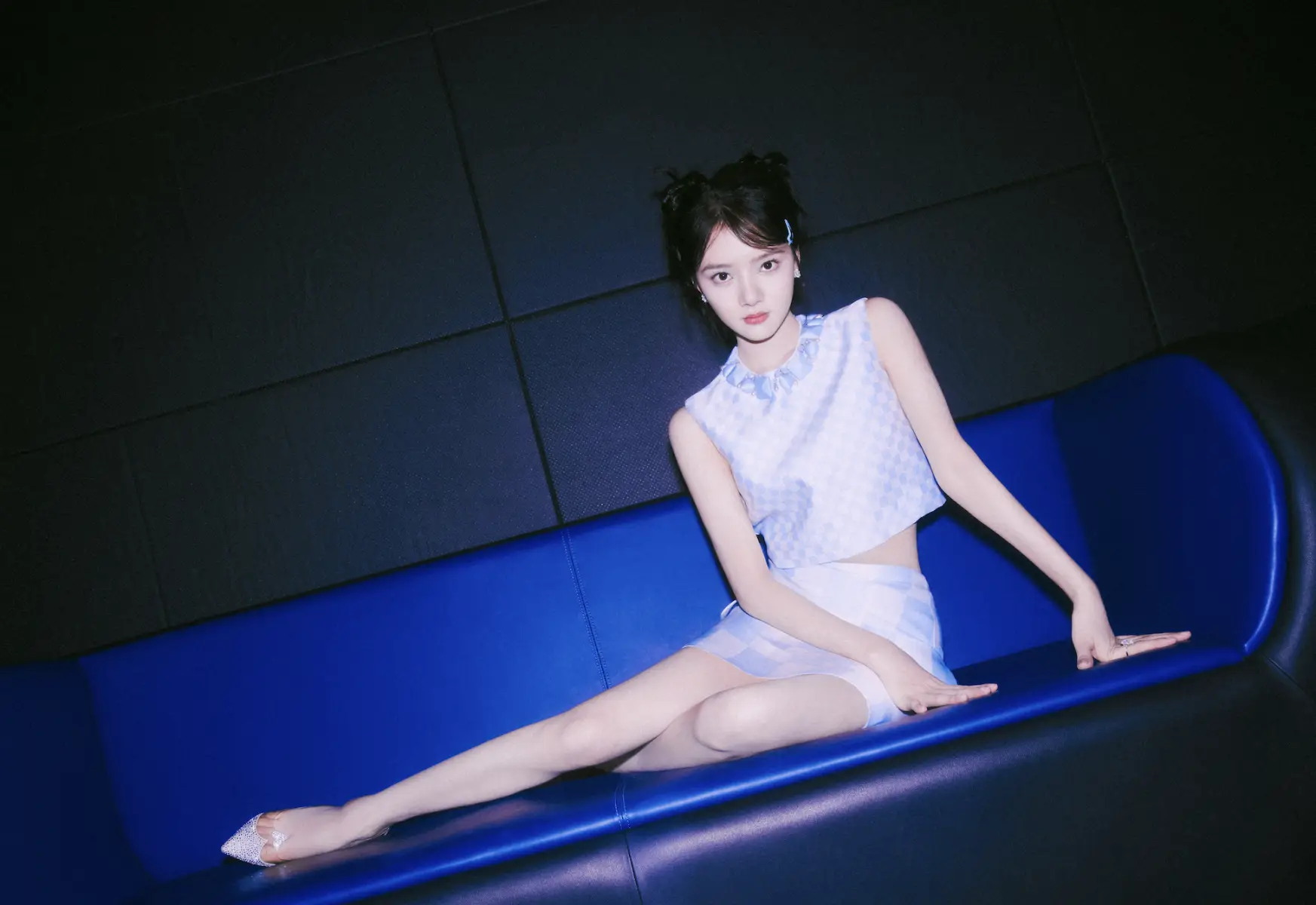 4月17日,任敏穿藍(lán)色無(wú)袖套裝,扎雙丸子頭別發(fā)夾,手托下巴表情靈動(dòng)好俏皮,沙發(fā)上拍照秀盈盈細(xì)腰和一雙修長(zhǎng)美腿。