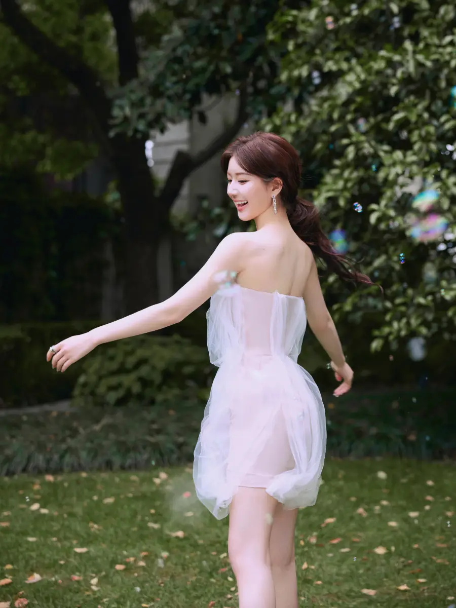 趙露思身穿抹胸紗裙,肌膚雪白。