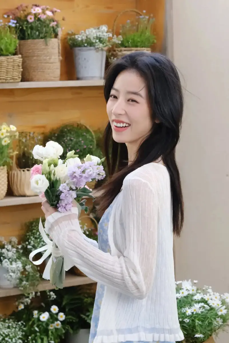 周雨彤穿藍色碎花裙溫潤如玉 長發(fā)披肩大氣明艷
