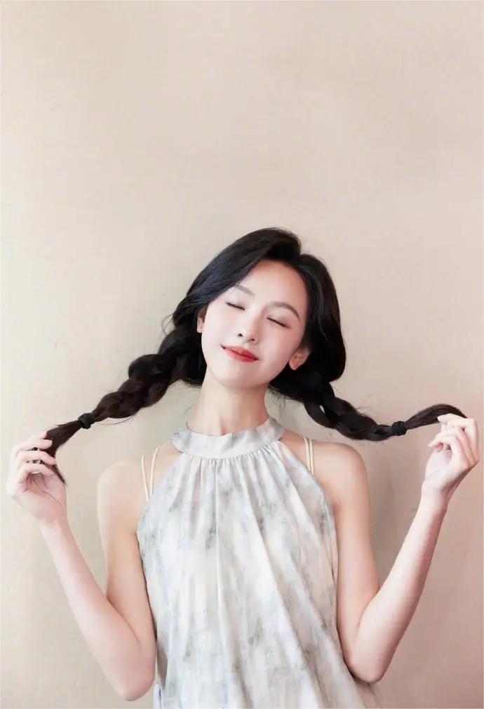 陳都靈雙手扯開(kāi)麻花辮,閉眼甜笑,好靈動(dòng)的少女感!