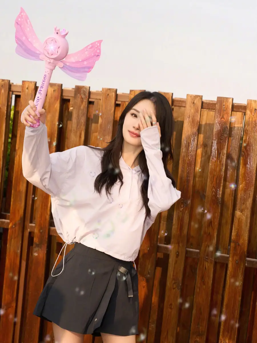 5月5日,楊冪在自己的社交媒體平臺(tái)發(fā)出想自己的一組美照,化身美少女戰(zhàn)士玩泡泡機(jī)漂亮又可愛。