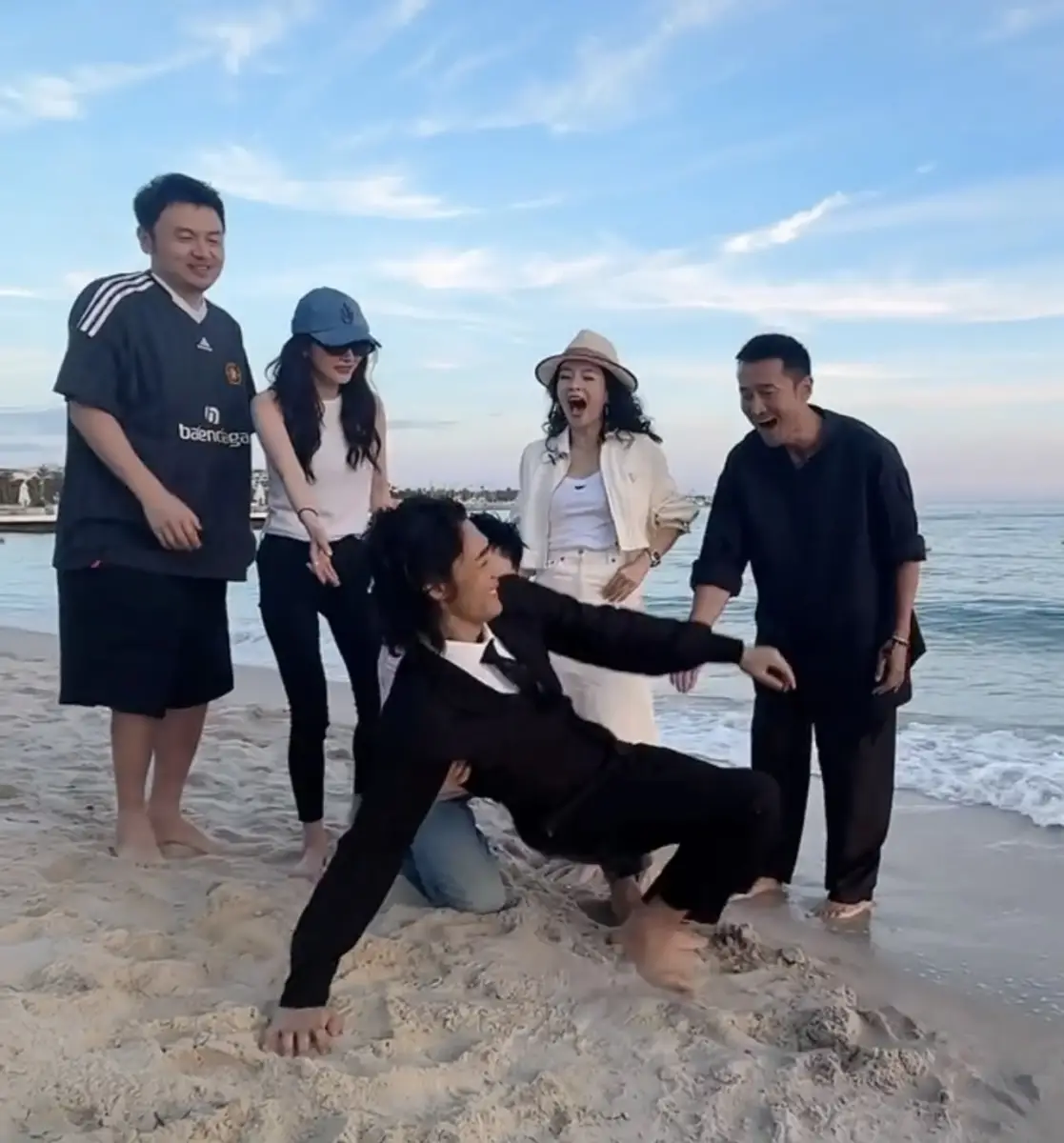 5月26日,章子怡在社交平臺曬《醬園弄》劇組合照,和楊冪、雷佳音、大鵬、此沙、王傳君沙灘玩鬧,氛圍超好。