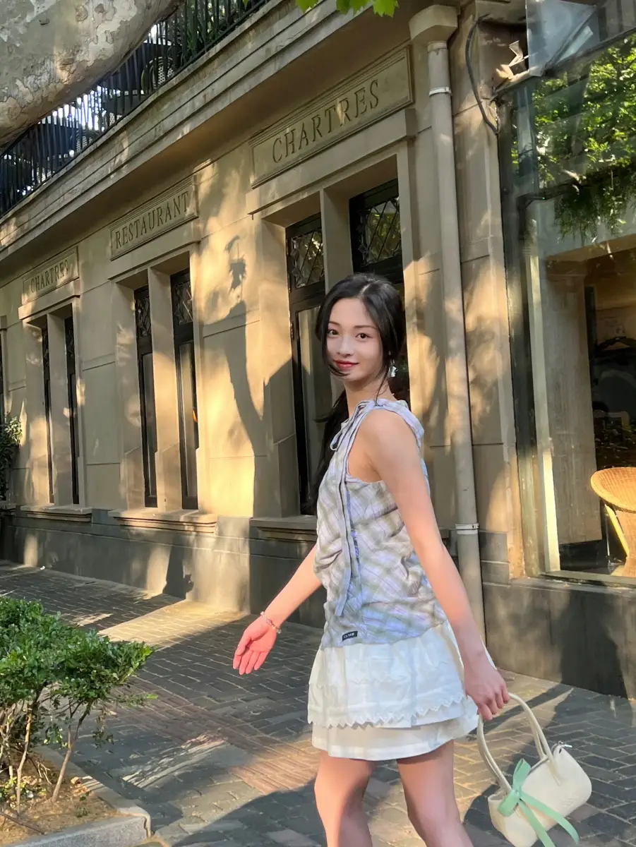 周潔瓊穿格紋背心配蕾絲短裙,太適合田園風(fēng)了。