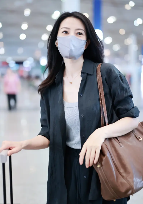 高圓圓著黑色襯衫知性大方 背褐色單肩包簡(jiǎn)約