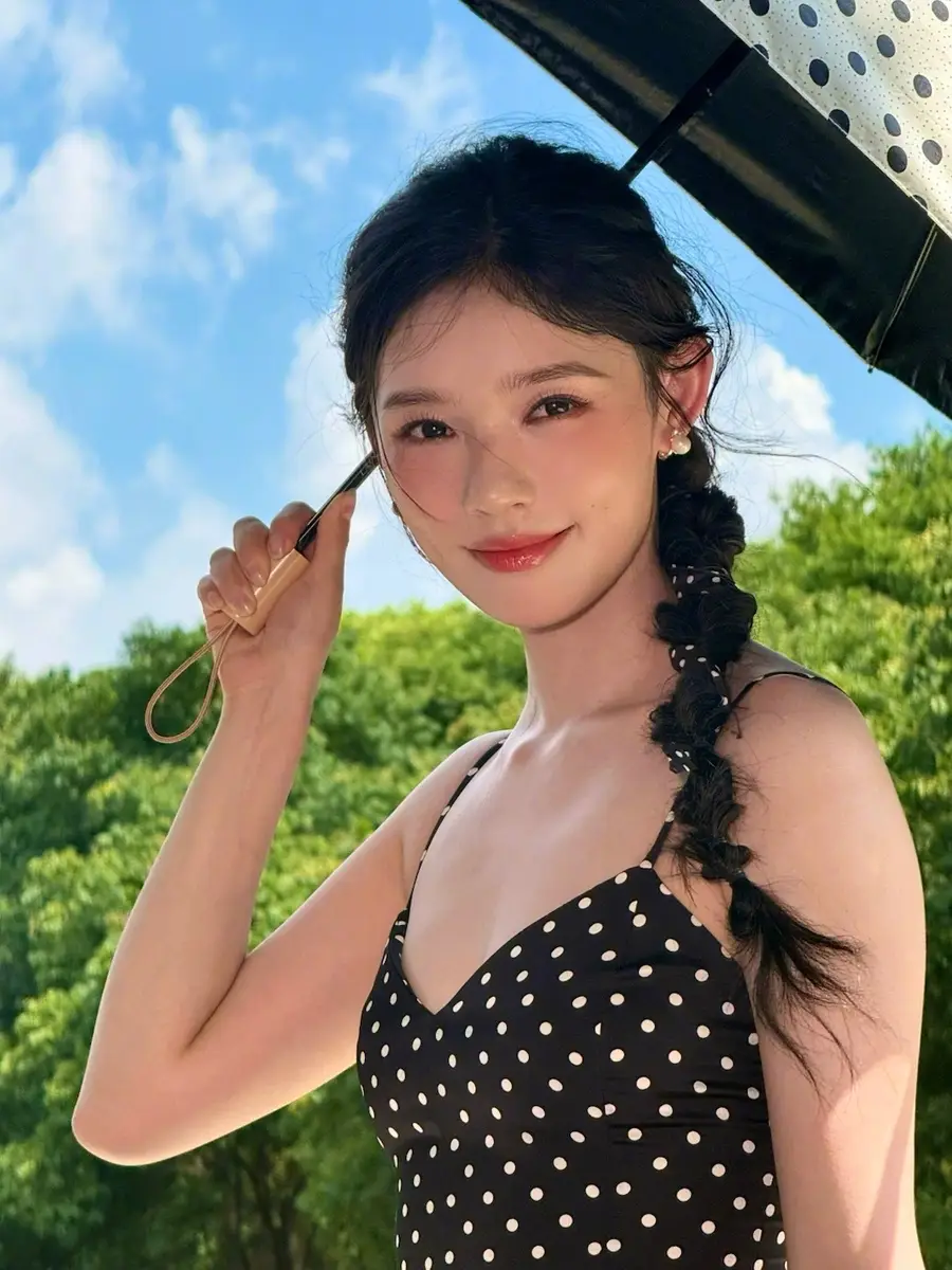 林允曬戶外美照元氣滿滿!穿黑色波點吊帶裙秀好身材