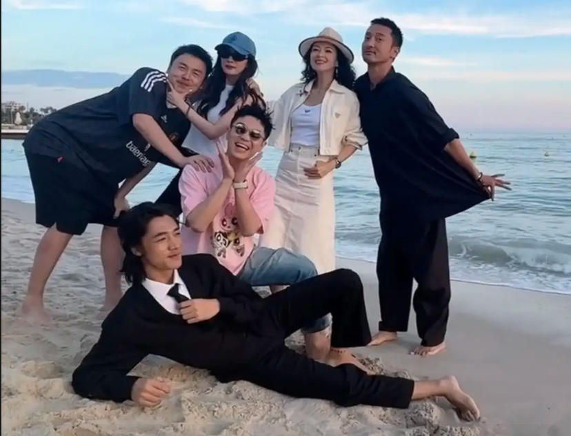 5月26日,章子怡在社交平臺(tái)曬《醬園弄》劇組合照,和楊冪、雷佳音、大鵬、此沙、王傳君沙灘玩鬧,氛圍超好。