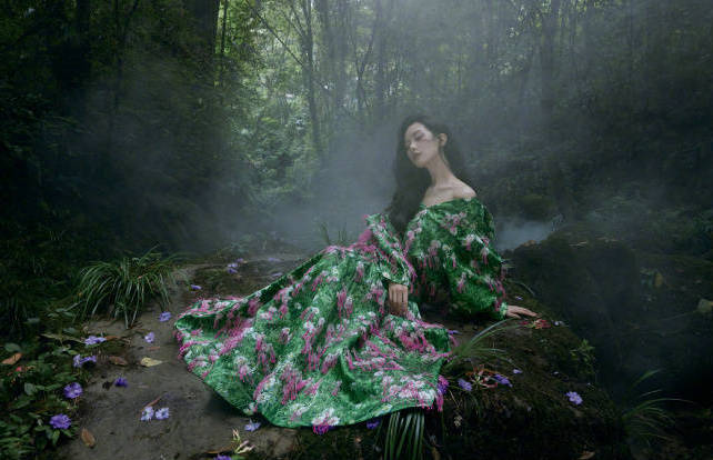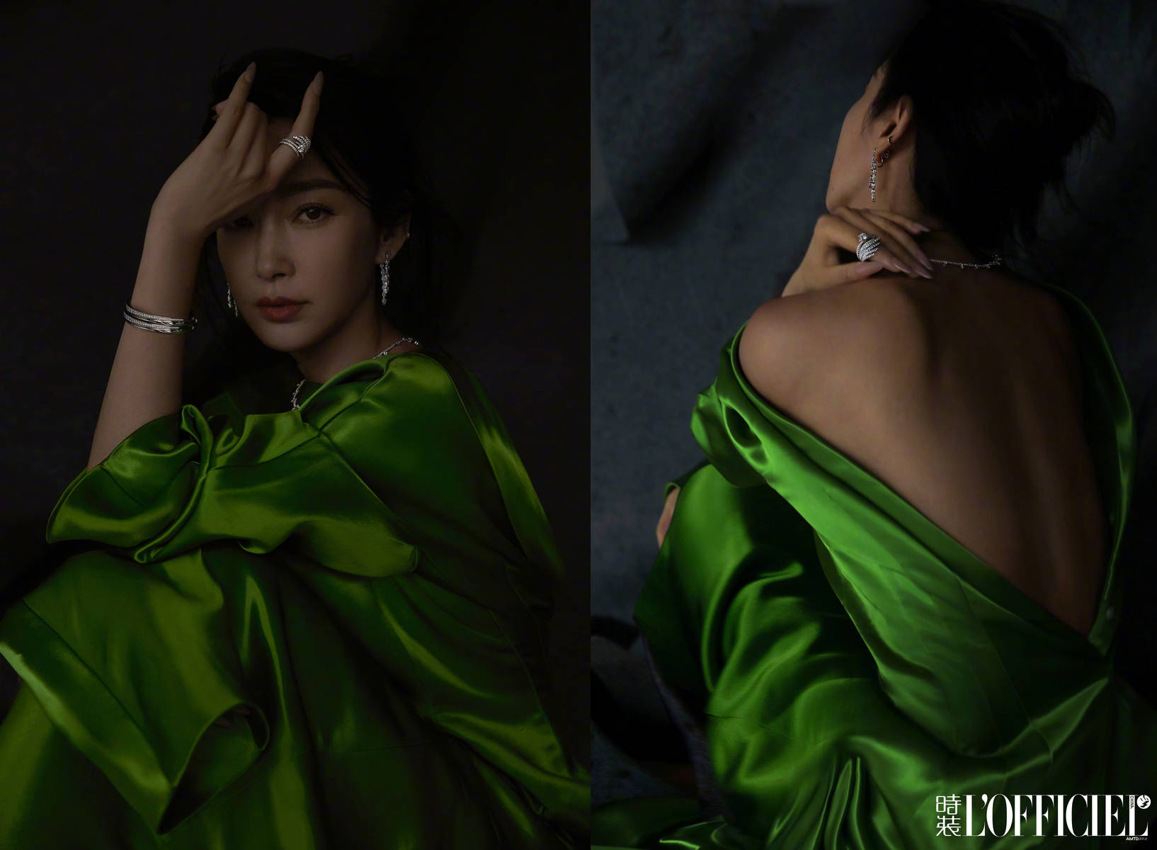 9月27日,李冰冰寫真釋出,綠色絲緞長裙,面紗掩面拂動,多種風(fēng)格駕輕就熟,嫵媚似青蛇。