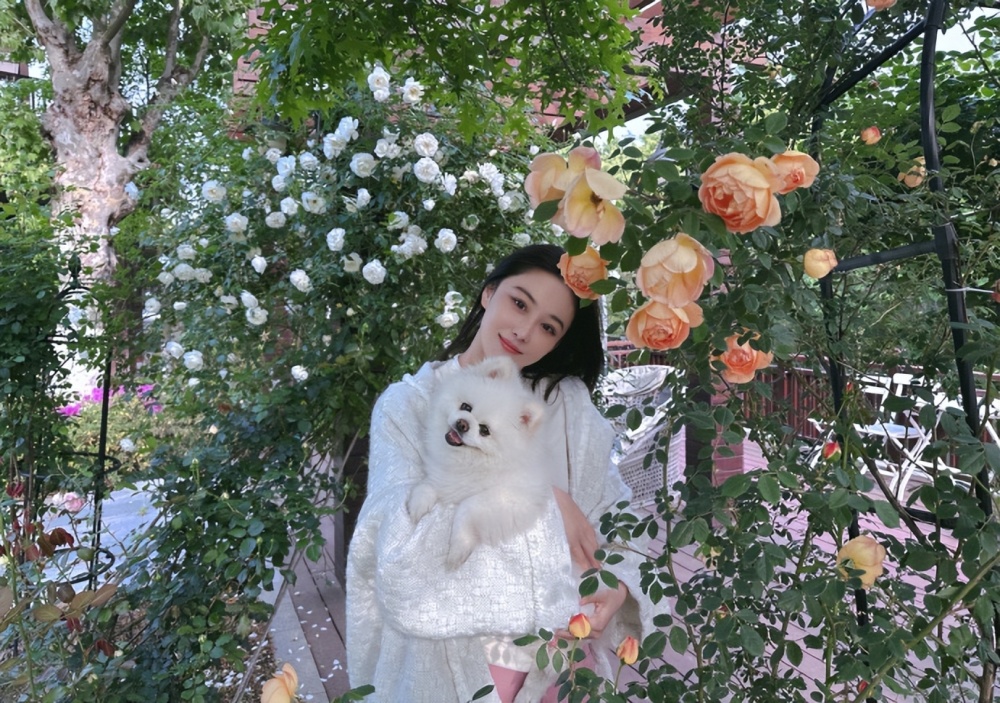 張馨予在自家花園拍照,老公視角下穿睡袍出鏡,完美演繹人比花嬌