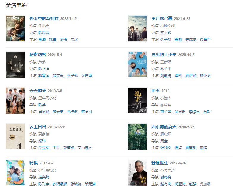 2016年,在劇情電影《西小河的夏天》中飾演顧曉陽。