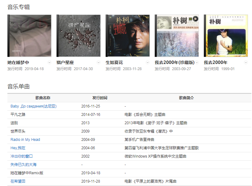 代表作品:平凡之路、那些花兒、白樺林、生如夏花、她在睡夢中、Colorful Days、火車開往冬天、在希望的田野上、New Boy、在木星