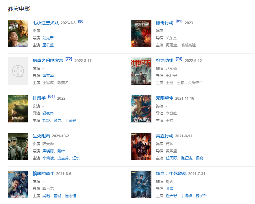 2023年2月3日,主演的網(wǎng)絡(luò)電影《七小汪警犬隊》在愛奇藝、優(yōu)酷雙平臺上映播出;6月3日,參演電影《破毒行動》開機(jī)。12月12日,參演的電影《破冰》播出。