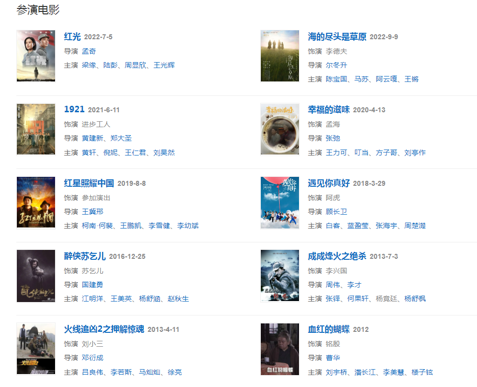 2021年5月25日,出演的重大革命歷史題材劇《光榮與夢(mèng)想》在北京衛(wèi)視、東方衛(wèi)視及騰訊視頻、愛奇藝、優(yōu)酷同步播出 ;9月15日,與安悅溪主演的電視劇《在希望的田野上》在騰訊視頻播出;參演電影《1921》; 參演電視劇《理想照耀中國》。