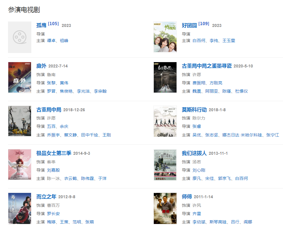 代表作品:陽光燦爛的日子、獨自等待、警察有約、西洋鏡、電影往事、圣誕玫瑰