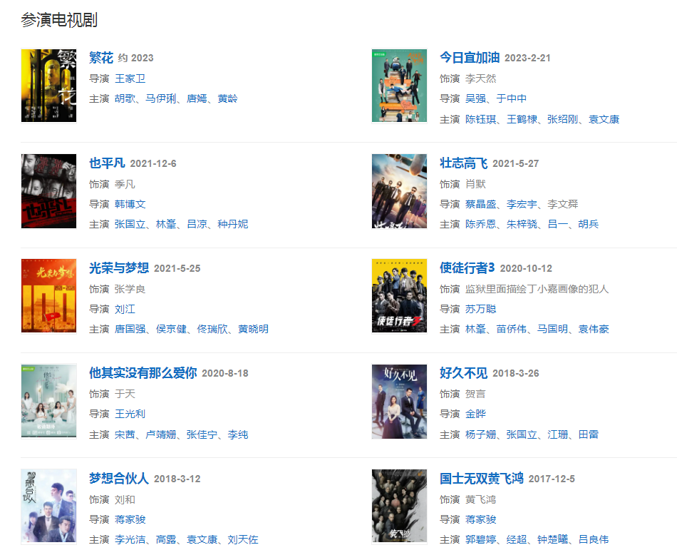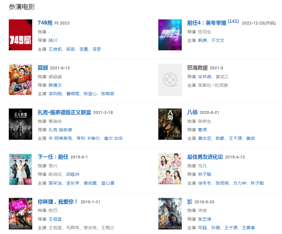 代表作品:影、致我們終將逝去的青春、私人訂制、前任攻略、國民大生活、也平凡