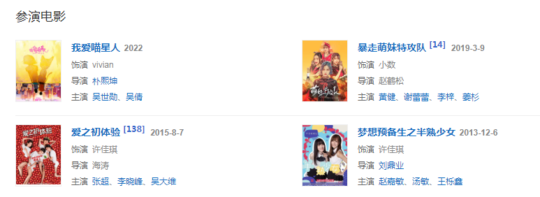2013年,許佳琪參演了現(xiàn)代青春勵(lì)志片《夢想預(yù)備生之半熟少女》,而這也是其個(gè)人的首部影視作品。2015年,她還出演了玄幻微電影《魔天記》,并參與演唱了該片主題曲《緣盡世間》。