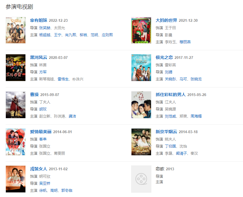 代表作品:粉紅色的回憶、天竺少女、美人吟、牧野情歌、西游記、飛馳人生、大媽的世界