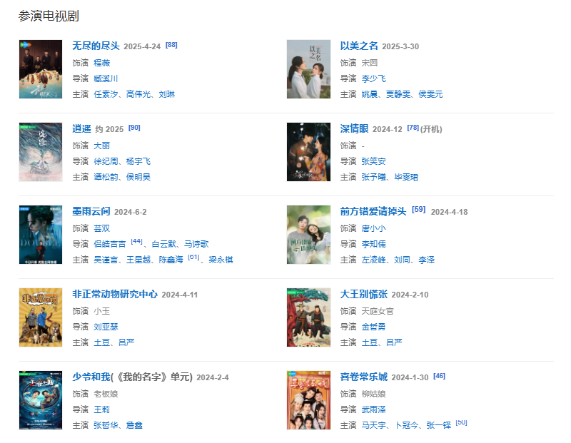 2025年1月28日,參加《2025年中央廣播電視總臺(tái)春節(jié)聯(lián)歡晚會(huì)》,表演小品《借傘》;3月8日,出演的喜劇愛情電影《非標(biāo)準(zhǔn)戀愛》上映;3月21日,參加的綜藝《乘風(fēng)2025》播出;4月24日,參演的電視劇《無盡的盡頭》播出;5月30日,參與配音的國產(chǎn)動(dòng)畫電影《時(shí)間之子》上映。