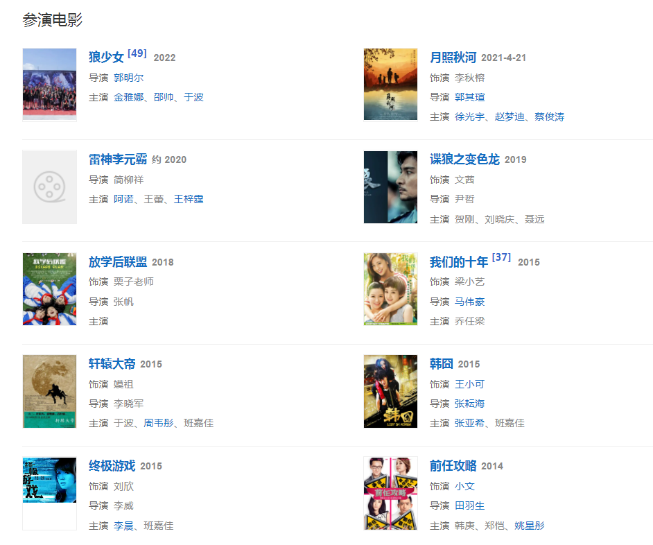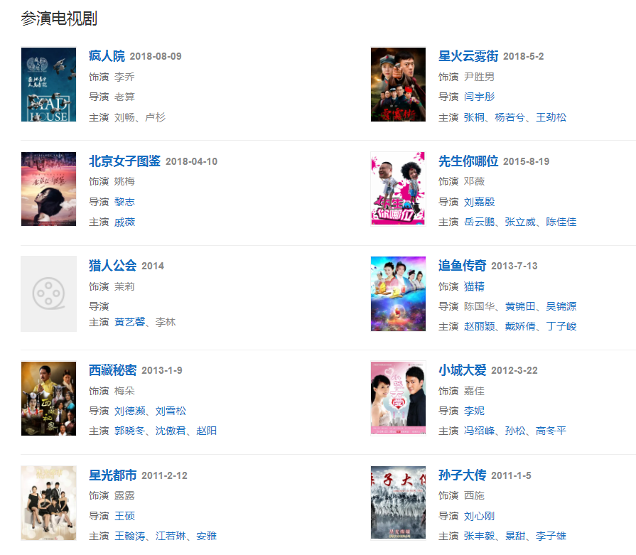代表作品:前任攻略、我們的十年、脫軌時(shí)代、軒轅大帝、小城大愛、西藏秘密、瘋?cè)嗽骸⒈本┡訄D鑒