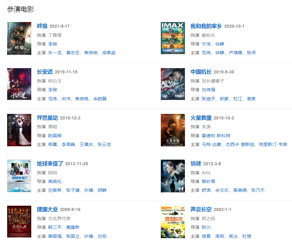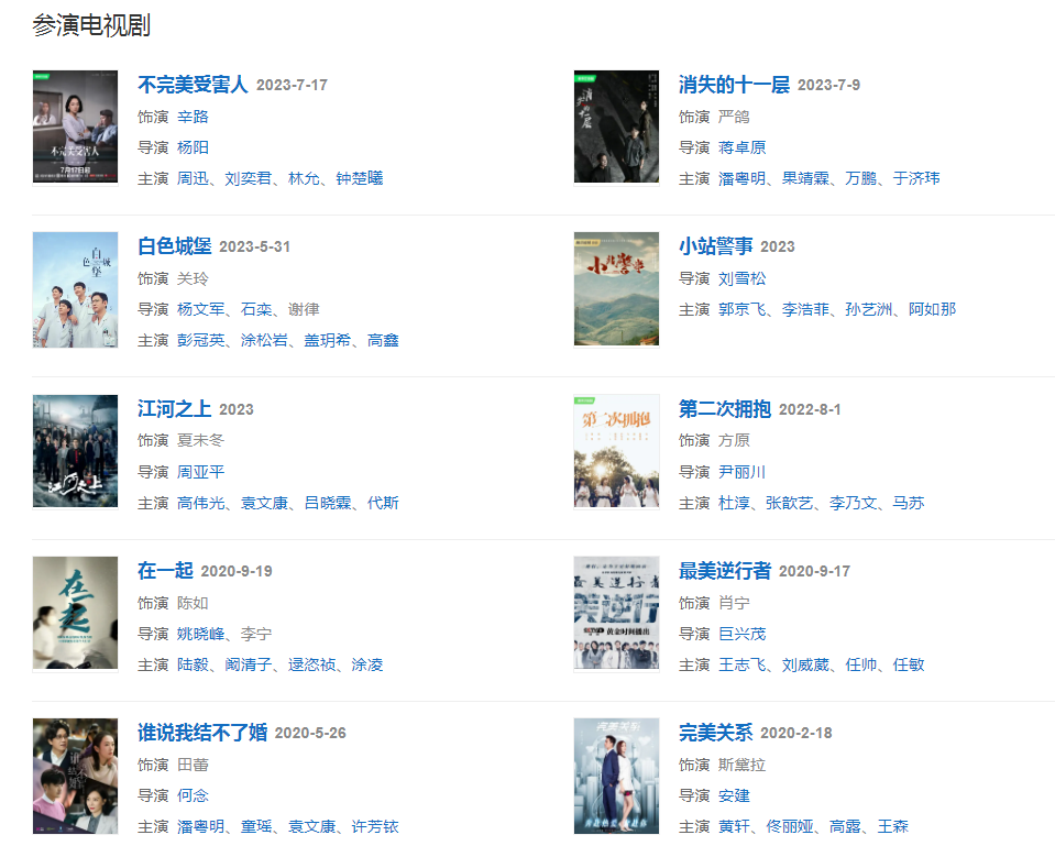 代表作品:暗算、旅人的故事、新上海灘、傾城之戀、鐵梨花、我愛男閨蜜、夫妻那些事、擇天記、和平飯店