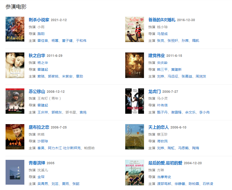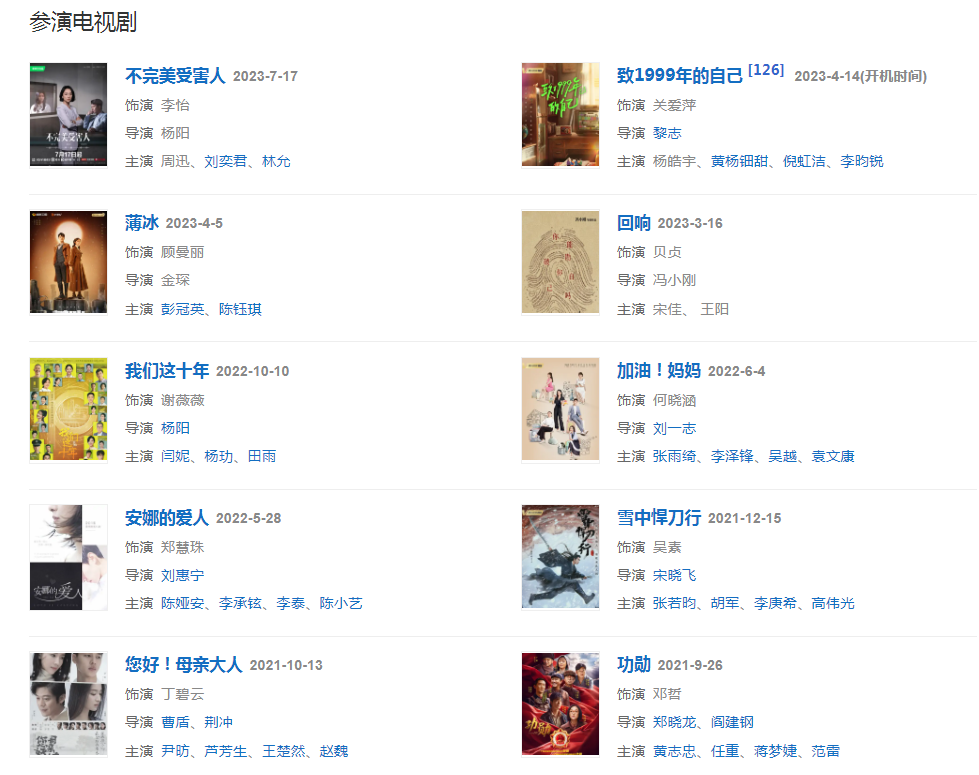代表作品:金粉世家、天若有情、相愛十年、梁山伯與祝英臺、幸福一家人、如懿傳、幸福時光、地下鐵、龍虎門