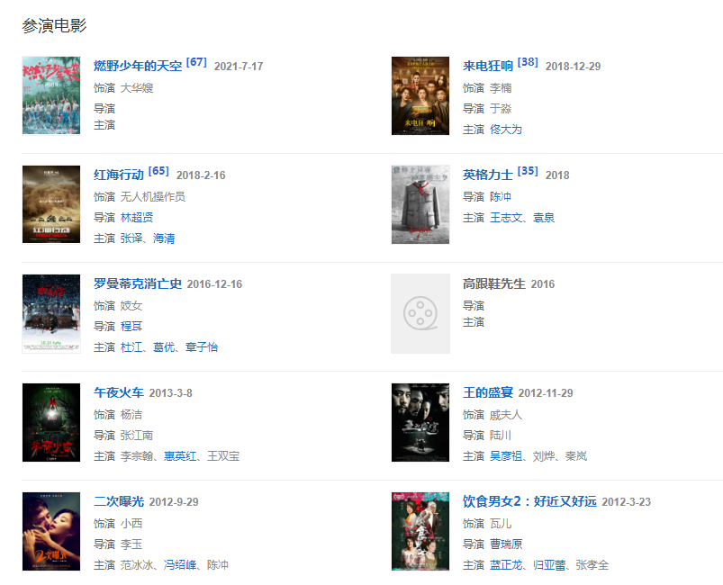 代表作品:歡天喜地七仙女、最后的格格、玫瑰江湖、孽緣、少年天子、我要成名、天師鐘馗、新聊齋志異、大清后宮之還君明珠、我的媳婦是女王、迷城、辣媽辣么美、媽媽是超人第三季