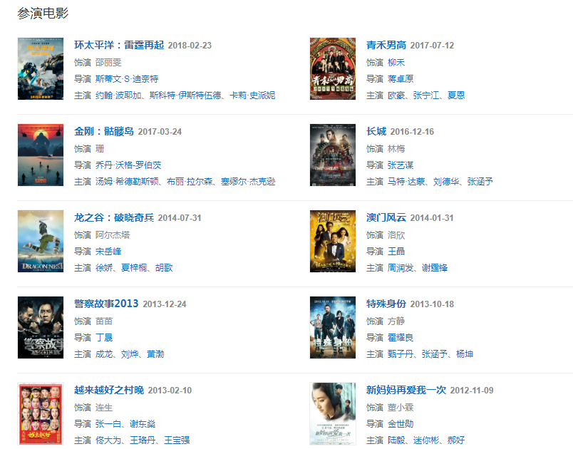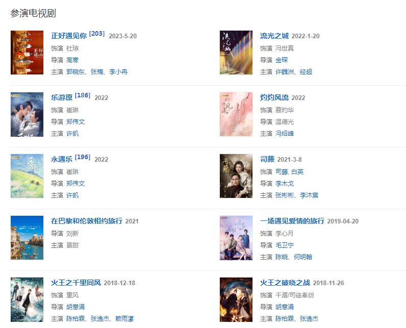 代表作品:司藤、大唐榮耀、班淑傳奇、流光之城、長城、澳門風云、警察故事2013