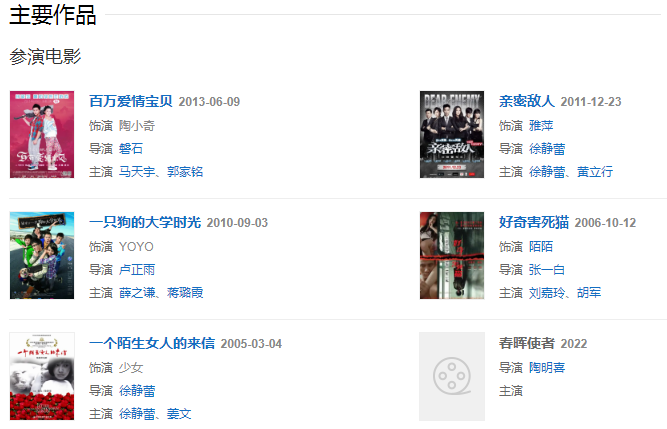 代表作品:一個陌生女人的來信、我的青春誰做主、你和我的傾城時光、暮白首