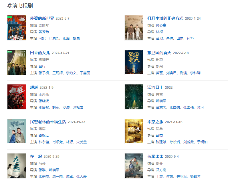 2020124日在2020年中央廣播電視總臺(tái)春節(jié)聯(lián)歡晚會(huì)上表演小品《父母愛情》。2020年主演現(xiàn)代軍旅劇《藍(lán)軍出擊》。