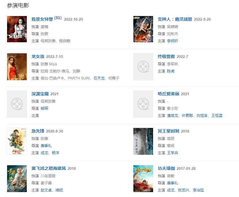 20171月,主演動作喜劇片《功夫瑜伽》,而她也憑借該片獲得了第四屆中澳國際電影節(jié)最佳女配角;6月,母其彌雅出席無錫靈山萬人瑜伽大會,并被印度總領事授予中國瑜伽形象大使;7月,在劇情電影《冥王星時刻》中飾演高麗。