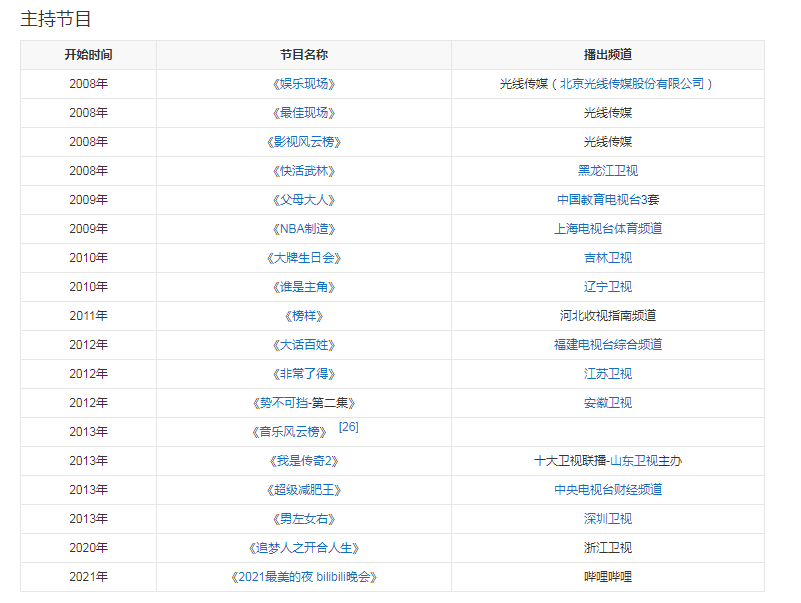 2008年起擔任光線傳媒旗下主打節(jié)目《娛樂現(xiàn)場》《最佳現(xiàn)場》《影視風云榜》的主持,同時也是黑龍江衛(wèi)視周末黃金強檔主打綜藝娛樂節(jié)目《快活武林》的女主持。