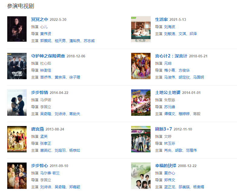代表作品:步步驚心、浮城大亨、阿嫂、唐宮燕