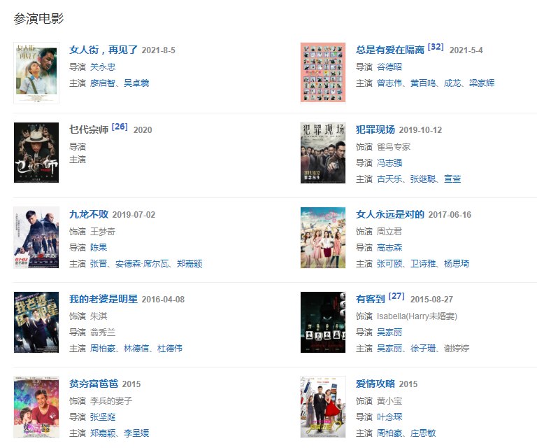 2021513日,主演的都市女性成長(zhǎng)劇《生活家》在央視八套播出。85日,與吳卓羲合作主演電影《女人街,再見了》在中國(guó)香港上映。