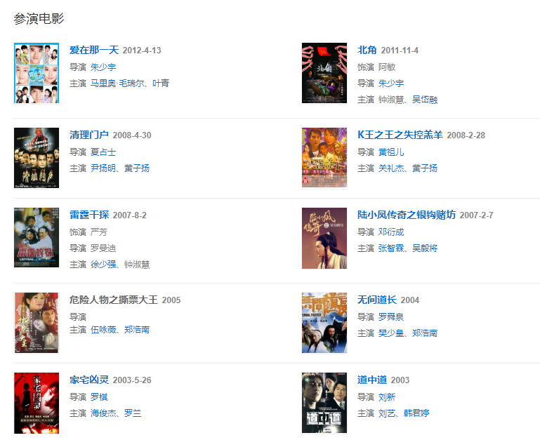 曾參與拍攝了《仙履奇緣》、《古惑女之決戰(zhàn)江湖》、《新男歡女愛》、《水滸英雄傳》、《機動部隊》和《 龍的天空》等電視劇,電影《白發(fā)魔女》和《古惑女》等。