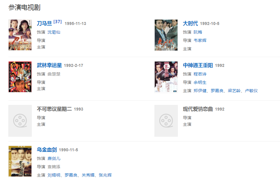 1992年主演時裝商戰(zhàn)劇《大時代》;同年,參演的電視劇《中神通王重陽》上映。